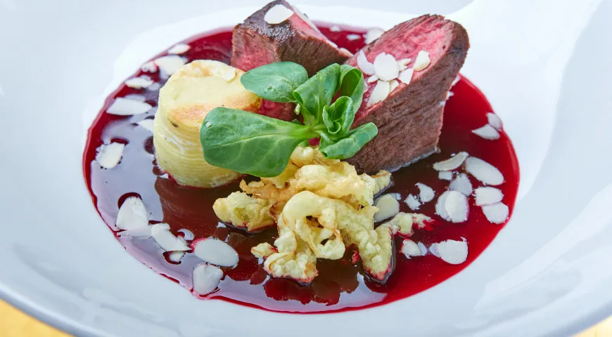 Филе ягненка с картофельным гратеном и гранатовым соусом
