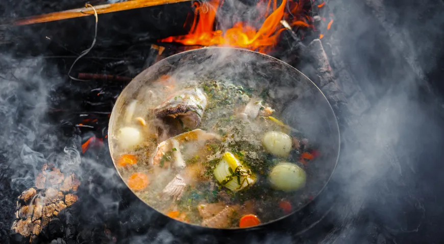 На пикниках в зонах, где разрешено разведение костров, очень здорово варить уху – или любой другой суп из рыбы и морепродуктов. Можно, не пересекая границы, оказаться в Марселе, отведав быстрый вариант буйабеса, или в Сан-Франциско – сварив чиопино. Для этого вам необходим самый обычный походный котелок и несколько сортов рыбы и морепродуктов – плюс большая банка рубленых помидоров в собственном соку, лук, чеснок и пряные травы. Бульон для этих супов лучше всего сварить из обжаренных там же, в котелке с маслом, а потом залитых водой панцирей аргентинской креветки. Для быстрого буйабеса лучше всего подойдет сочетание стейка семги с филе палтуса, филе пикши и филе трески + мидии в раковинах + сама аргентинская креветка. А для чиопино – стейк семги с филе тунца, филе красного окуня и филе минтая + мидии или морской котейль. К буйабесу принято подавать тосты с соусом айоли – а лучше поджарьте над углями хлеб и намажьте его риетом из минтая с вялеными томатами.