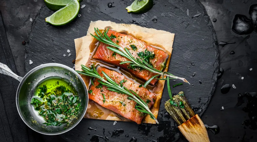 Для качественной рыбы и морепродуктов маринад – для улучшения вкуса или текстуры – совершенно не нужен, они и так прекрасны. Другое дело, если вы хотите придать филе определенный аромат и оттенок вкуса. В любом случае, нежные морепродукты не следует мариновать дольше часа, а чаще всего достаточно 20 минут. Рыба и морепродукты хорошо «дружат» в маринаде с пряными травами, чесноком, имбирем, чили, цитрусовыми ароматами, лемонграссом и листьями лайма. Кроме того, хороши соусы: соевый, терияки, срирача, рыбный, ткемали.