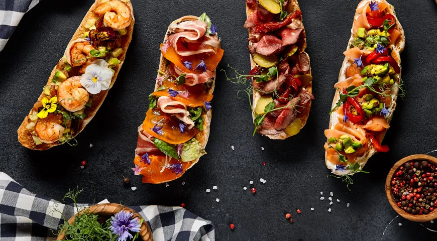 Даже если часть вашей компании – страстные мясоеды и никак не могут без шашлыков-шашлыков, все равно никто не откажется от вкусной рыбной закуски. И для пикника это точно брускетты! Можно купить разного хлеба: белый багет, чиабатту и бородинский, нарезать ломти толщиной примерно 1,5 см, сбрызнуть с одной стороны оливковым маслом и буквально мгновенно (не дольше 15–20 секунд!!!) обжарить с этой масляной стороны над углями. А затем выложить брускетты так: