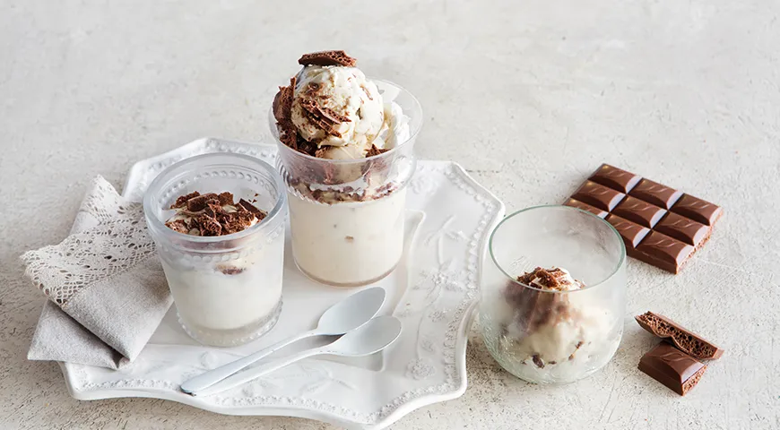 - Процедите смесь, дайте немного остыть и смешайте с оставшимся молоком. Порубите шоколад ножом на крупные кусочки, добавьте в заготовку для мороженого и перемешайте.