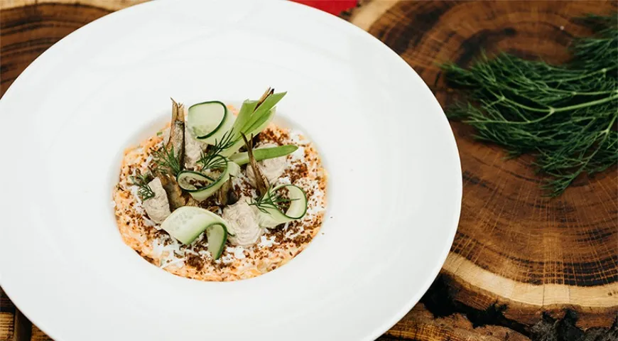 Из новых закусок меню ресторана «Бульон Крутон» – салат с говядиной пастрами (410 руб.) и со шпротами (230 руб.) плюс оригинальный вариант винегрета со скумбрией холодного копчения (350 руб.) и традиционная сельдь под шубой (340 руб.) в форме изысканных мини-рулетиков.