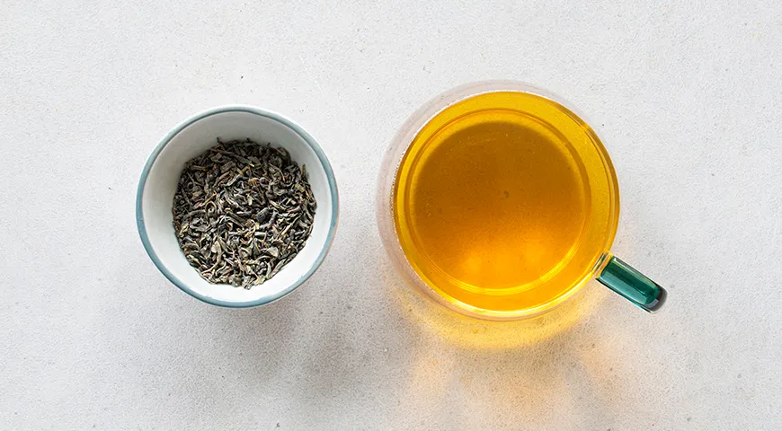 - В кипящей воде заварите зелёный чай, дайте настояться 4–5 мин и процедите.