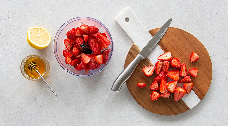 - Половину клубники пробейте блендером, добавьте лимонный сок и мёд. Оставшуюся клубнику нарежьте кусочками.