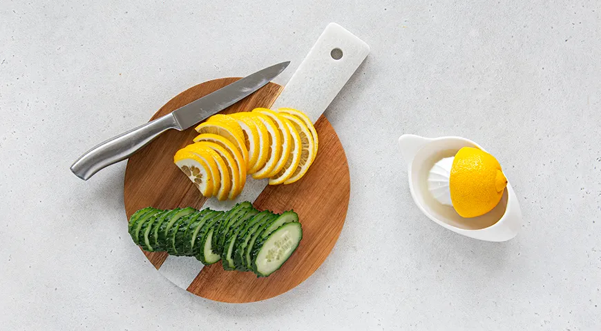 - Огурец крупно нарежьте, половинку лимона нарежьте дольками, из оставшегося лимона выжмите сок.