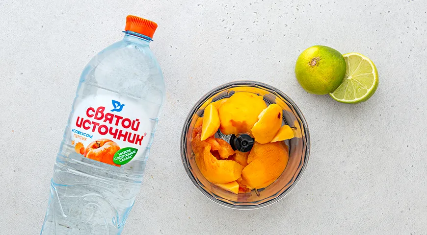 - Нарежьте персики кусочками и положите в блендер. Добавьте качественную воду Святой Источник #совкусом Персик и сок лайма и пробейте блендером до однородной консистенции.