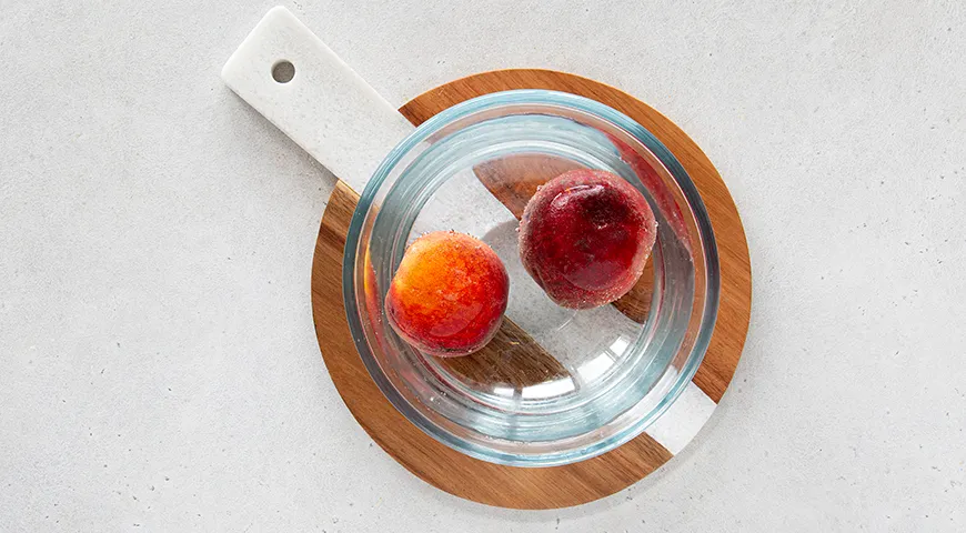 - Очистите персики, для этого залейте их кипятком и оставьте на 30 сек.