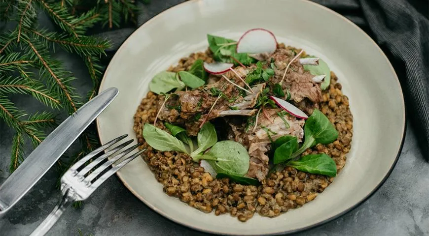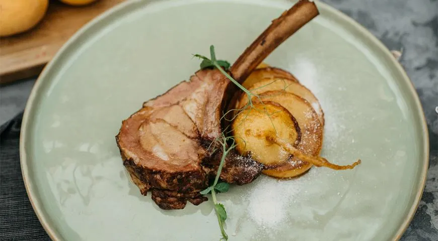 После супа плавно переходим к основным блюдам — ветчине из телятины с репой (960 руб) и козленку с машем и кремом из лука-порея (1480 руб).