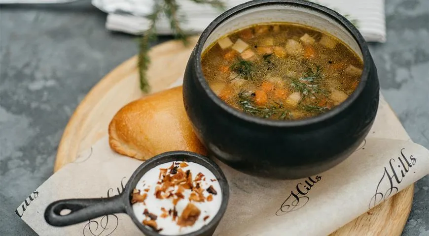 На первое предлагается грибная похлёбка (380 руб) — ароматная и наваристая, именно такая и нужна зимой!
